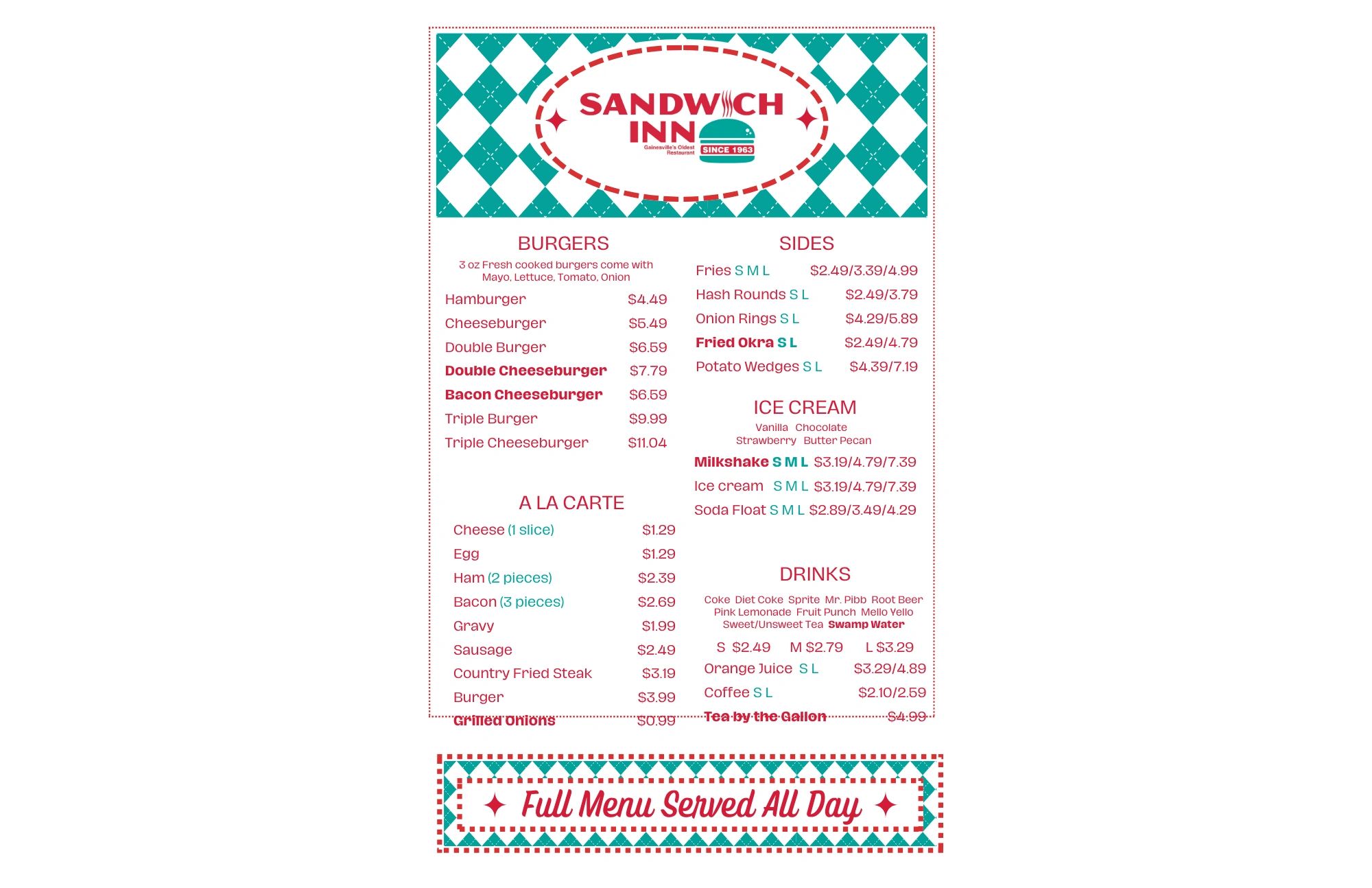 Since 1963 Sandwich Inn has known that fast food doesn't have to mean sacrificing quality or taste. That's why we use only the freshest ingredients in our burgers, fries, and shakes, and cook everything to order. Whether you're in the mood for a classic burger, a fried egg breakfast sandwich, or something with a southern twist, we've got you covered with good food fast. So why wait? Come see us today and taste the difference for yourself!